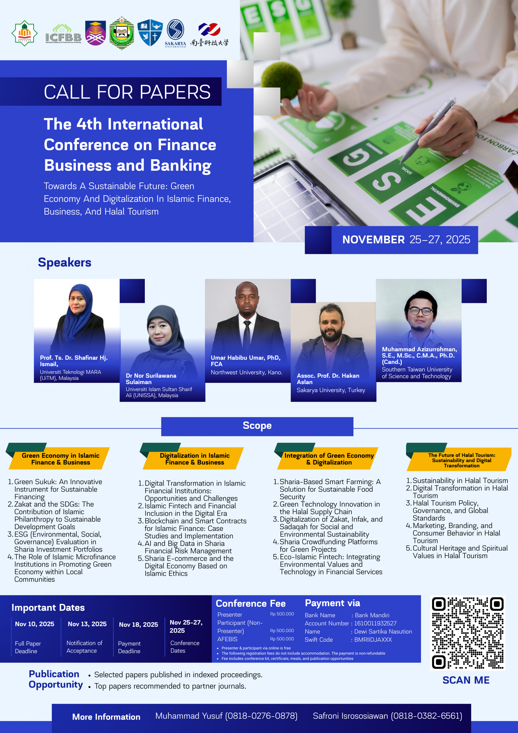 This issue includes selected papers from the 4th International Conference on Finance, Business, and Banking (ICFBB) held on November 25–27, 2025, under the theme "Towards A Sustainable Future: Green Economy and Digitalization in Islamic Finance, Business, and Halal Tourism."